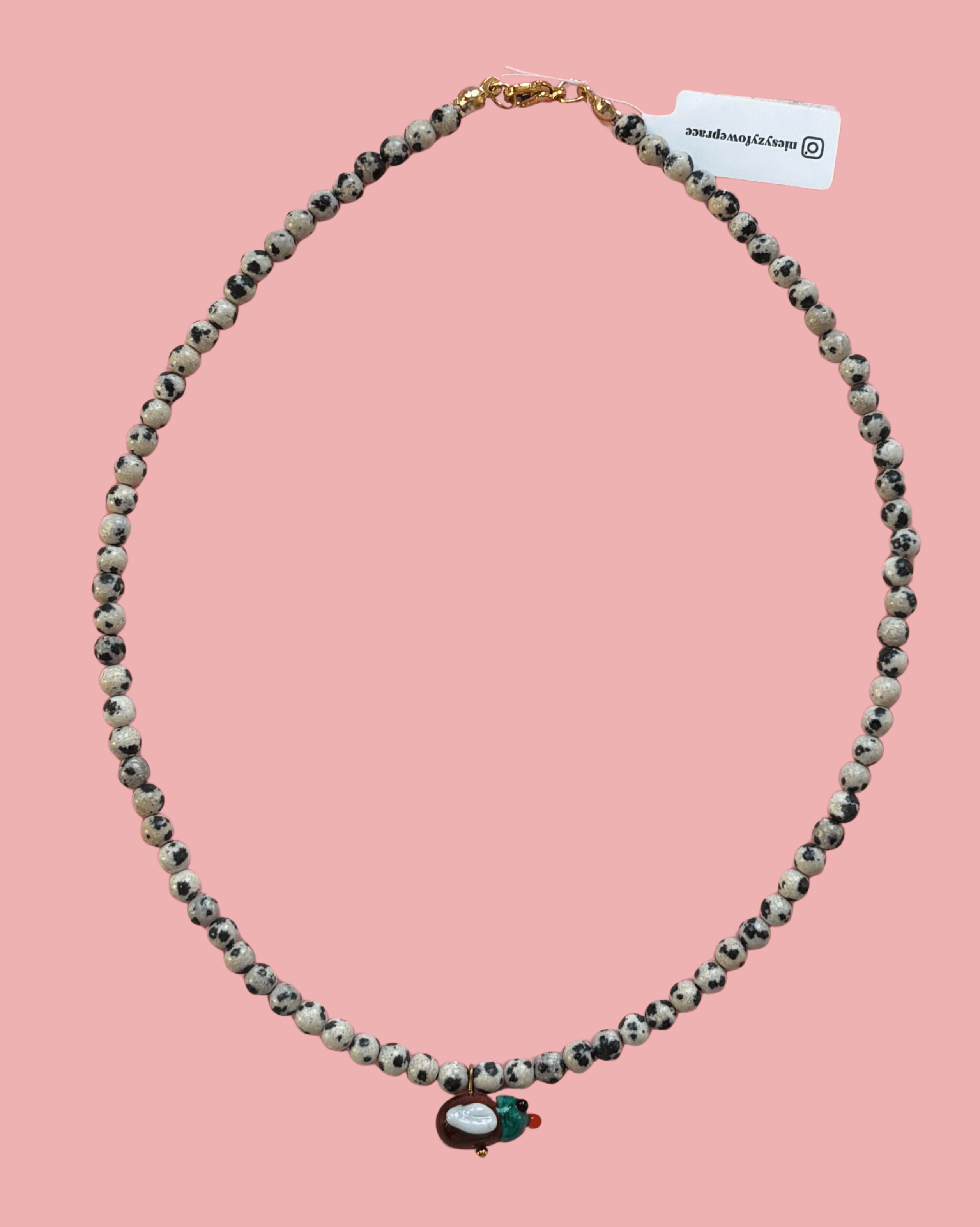 Materiały: jaspis dalmatyński, kaczka ręcznie wykonana ze szkła na palniku