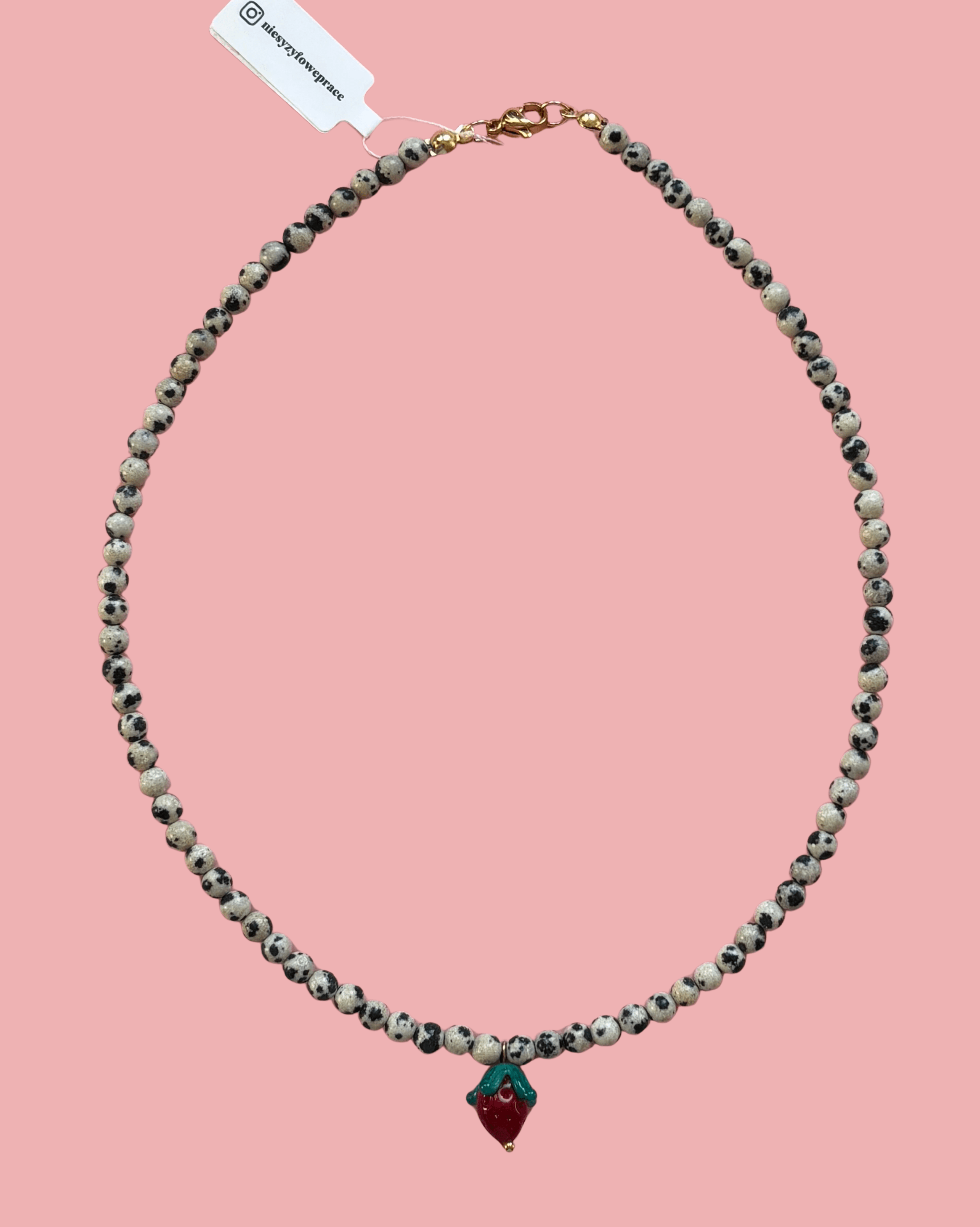 Materiały: jaspis dalmatyński, truskawka ręcznie wykonana ze szkła na palniku
