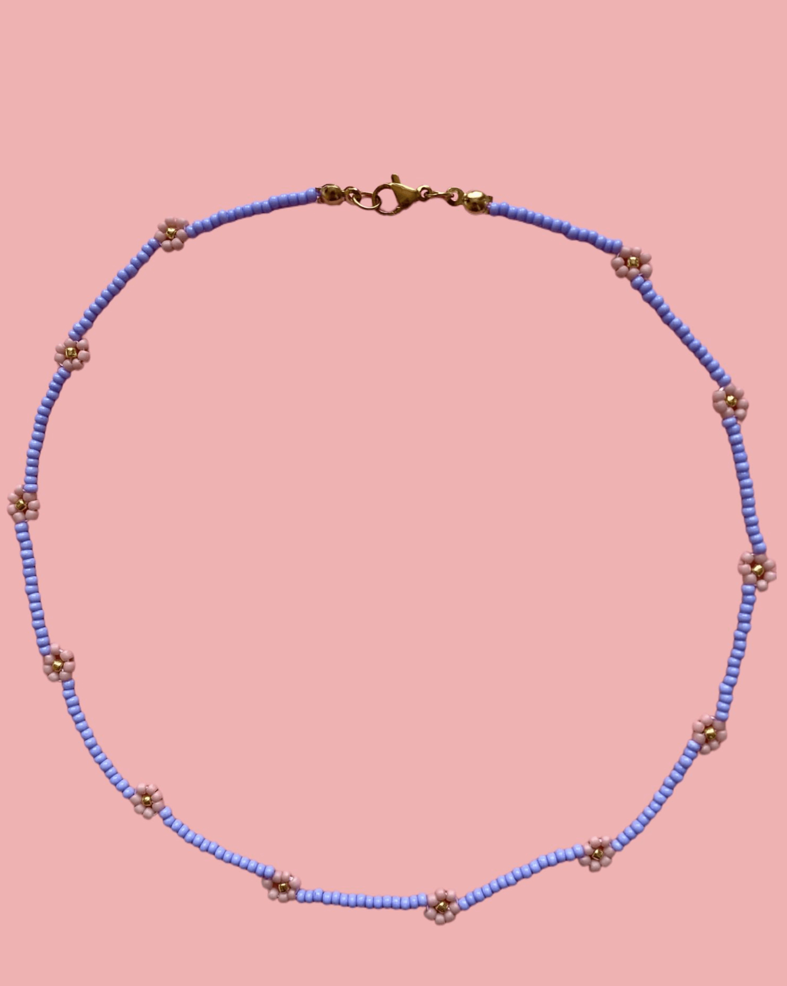 Naszyjnik z kwiatkami, o długości 40 cm, został wykonany ze szklanych koralików w kolorze niebieskim, różowym i złotym, które razem tworzą delikatne kwiatowe wzory. Jego lekka i zwiewna konstrukcja z nici jubilerskiej sprawia, że jest on doskonałym dodatkiem do codziennych, luźnych outfitów, a także do subtelnych letnich sukienek.