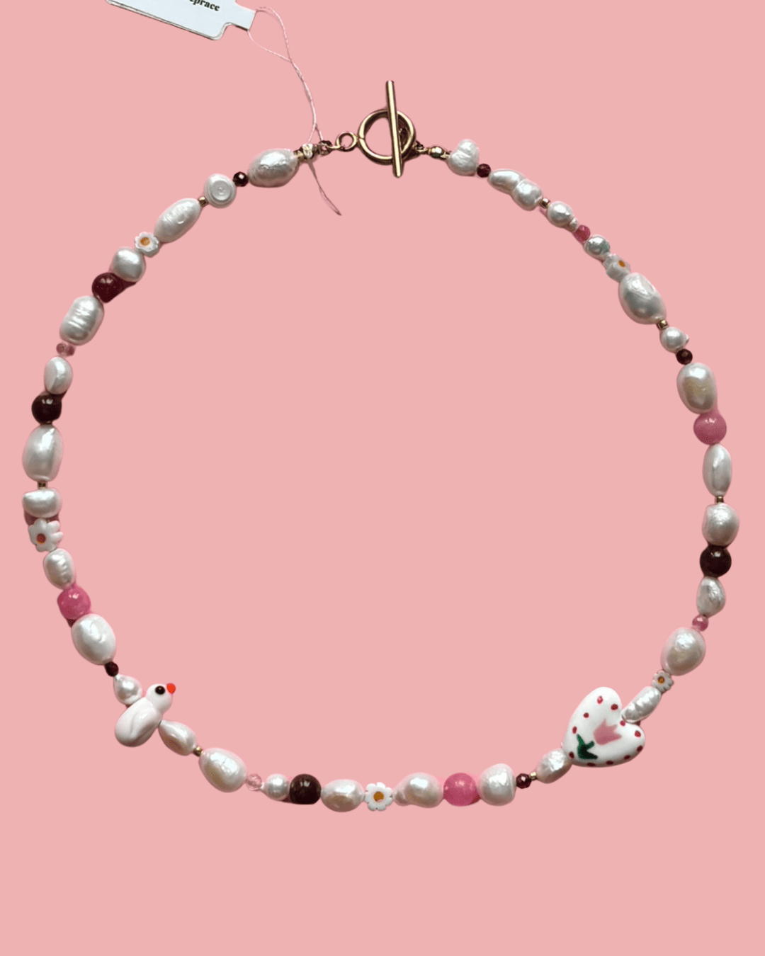 Naszyjnik z perłami z białą kaczką i ceramicznym sercem