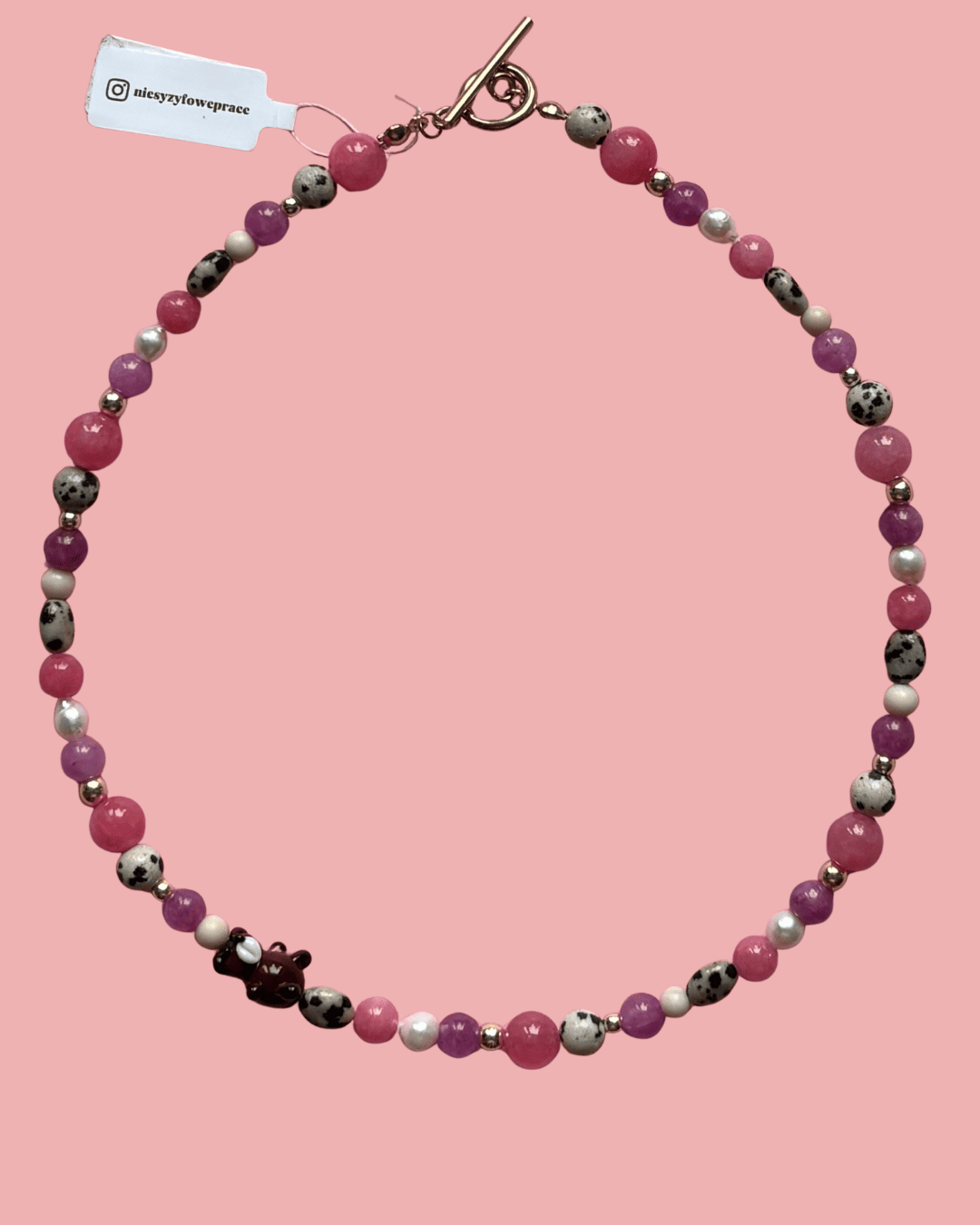 Materiały: perły naturalne, jadeit, kamień rzeczny, jaspis dalmatyński, hematyt, miś ręcznie wykonany ze szkła na palniku