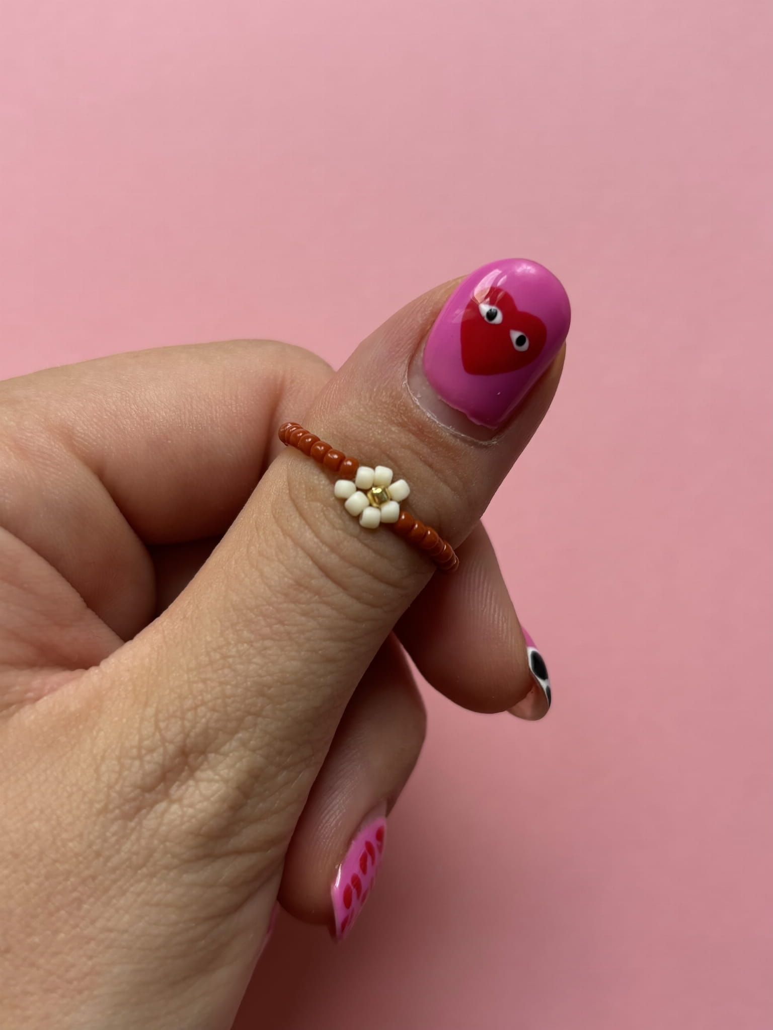 Pierścionek z rudymi koralikami z ręcznie plecionym kwiatkiem. Wykonany ręcznie na gumce elastycznej.