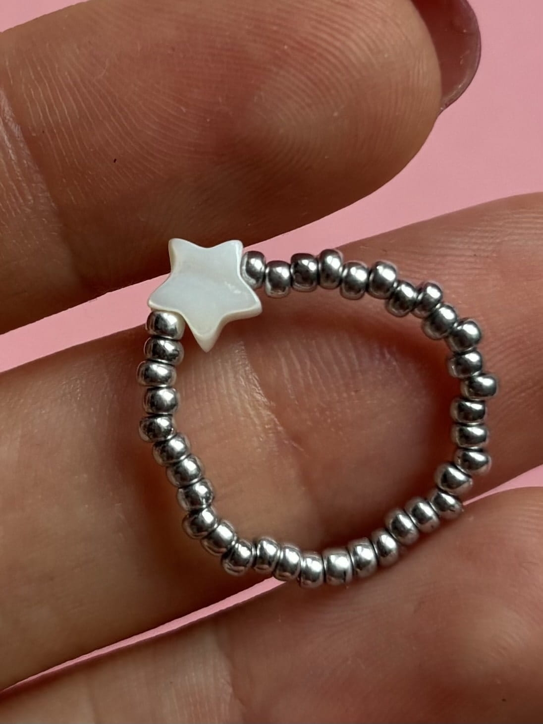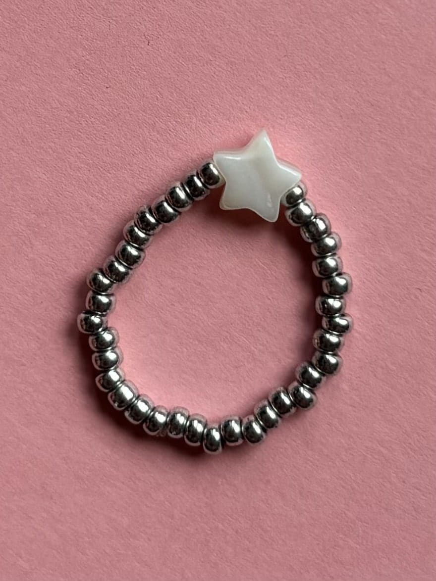 Pierścionek z koralików w srebrnym kolorze z gwiazdką.