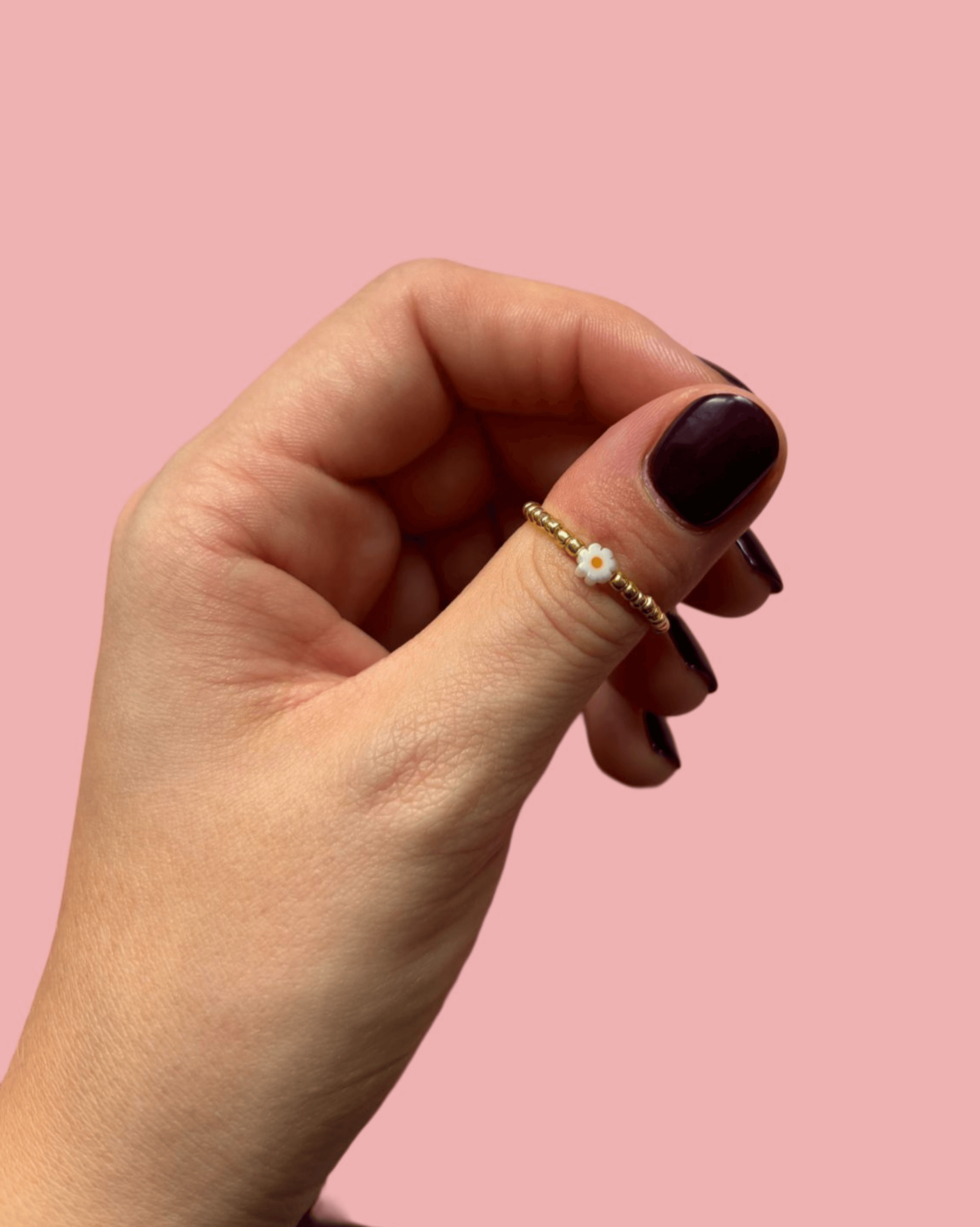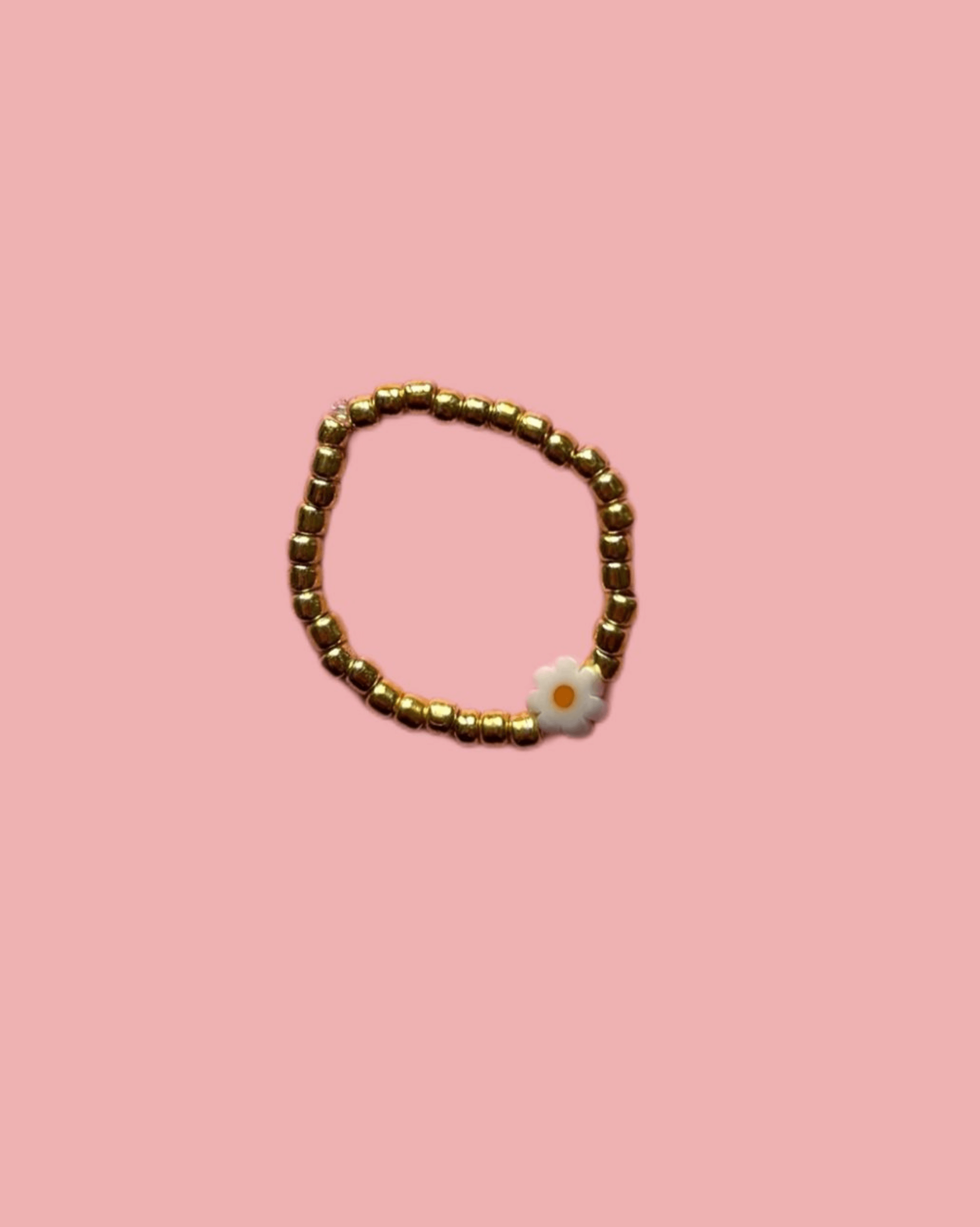 Pierścionek ze szklanych, złotych koralików ze stokrotką